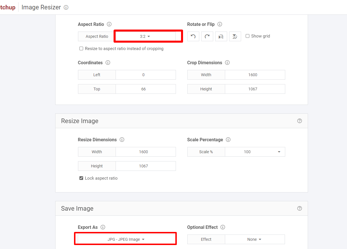Once the photo is uploaded, choose the ratio 3:2 and the JPG format.